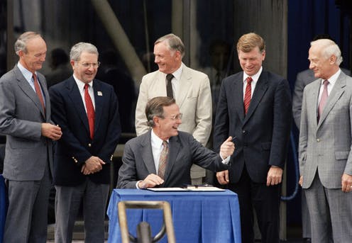 In 1989, President Bush announced his new Space Exploration Initiative, surrounded by the 3 members of the historic Apollo mission. He hoped this initiative would help the US get another person on the Moon and try to get to Mars. http://theconversation.com/george-h-w-bushs-overlooked-legacy-in-space-exploration-108148. Accessed 3 Feb. 2020.