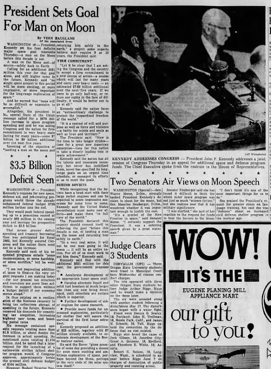A newspaper clipping the day after President John F. Kennedy (JFK) delivered his speech on America's goals towards reaching the moon along with several perspectives of political figures regarding this event and the plan. www.newspapers.com/clip/31634264/president_john_f_kennedy_announces/. Accessed 3 Nov. 2019.